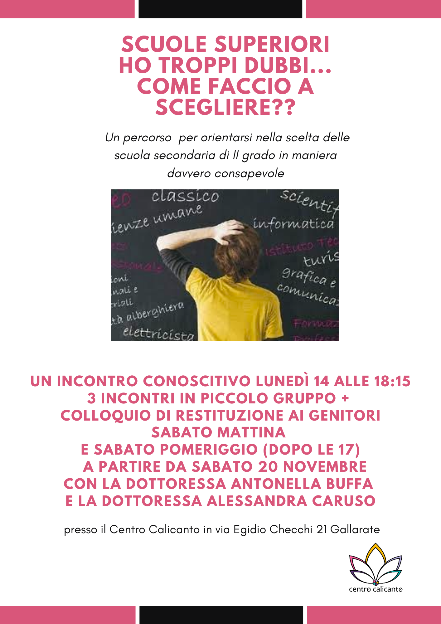 Il Centro Calicanto è lieto di presentarvi il volantino del Percorso per orientarsi nella scelta della Scuola Superiore.